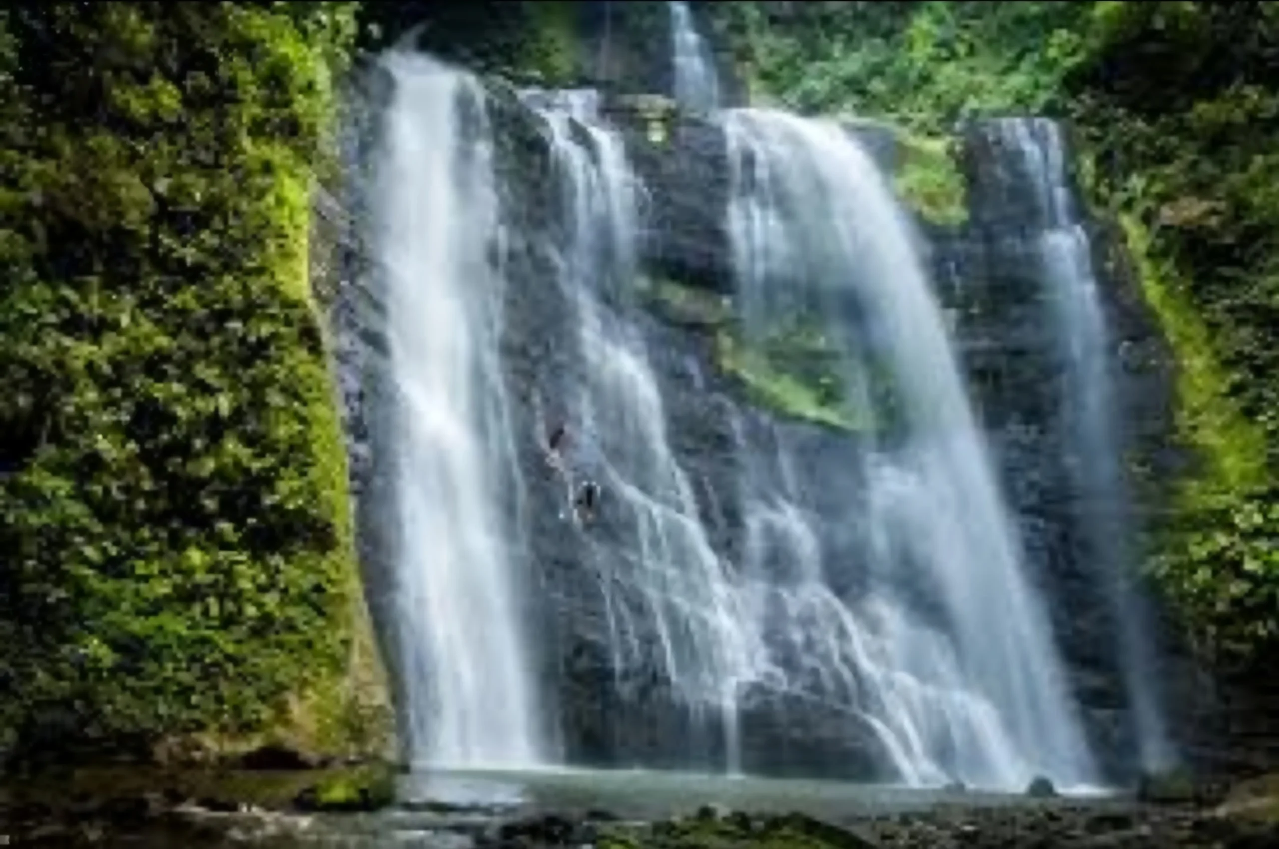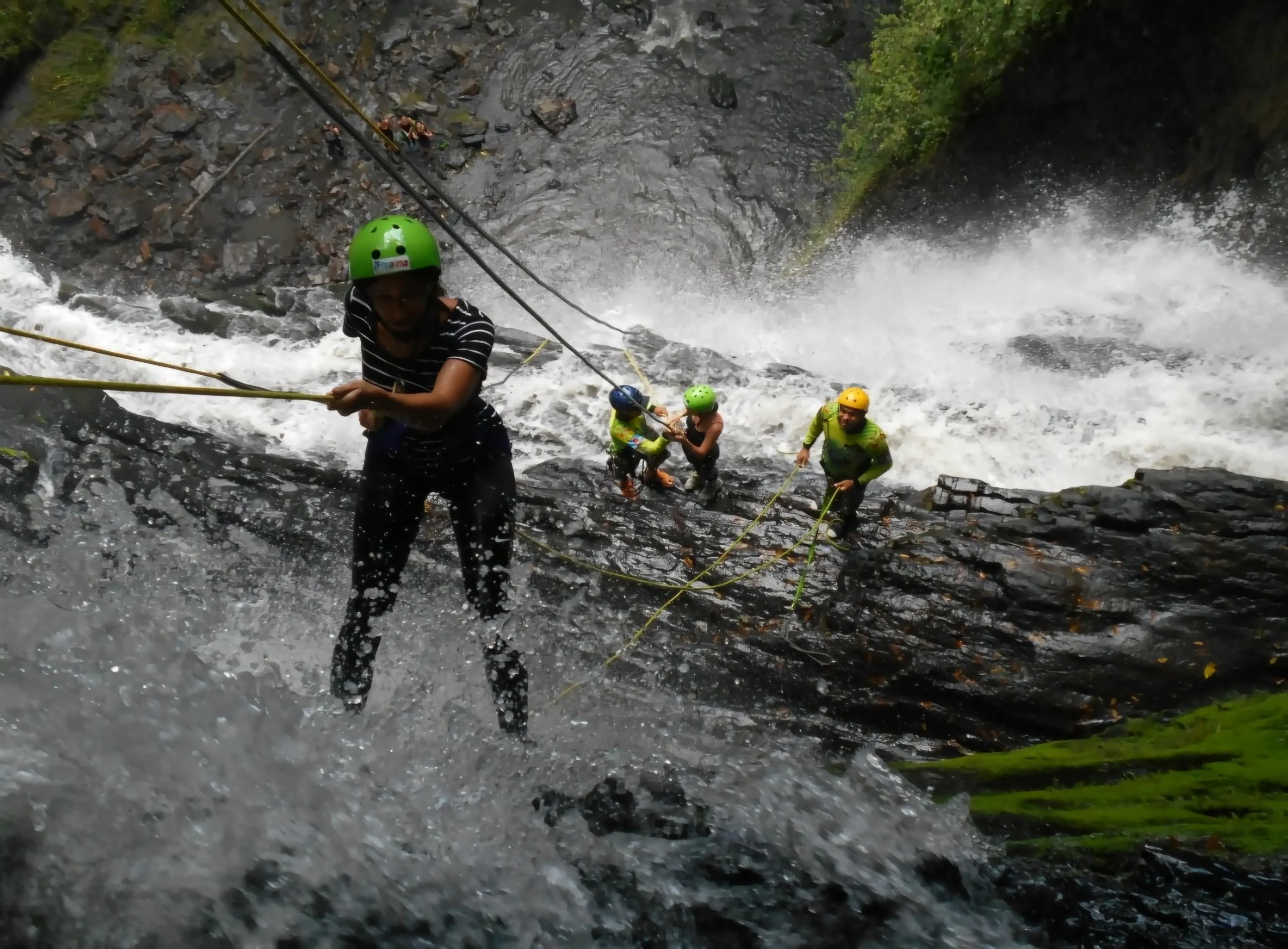Un descenso vertical controlado por una cascada natural imponente, utilizando cuerdas, arneses y técnicas especializadas, acompañado por guías expertos durante toda la actividad.