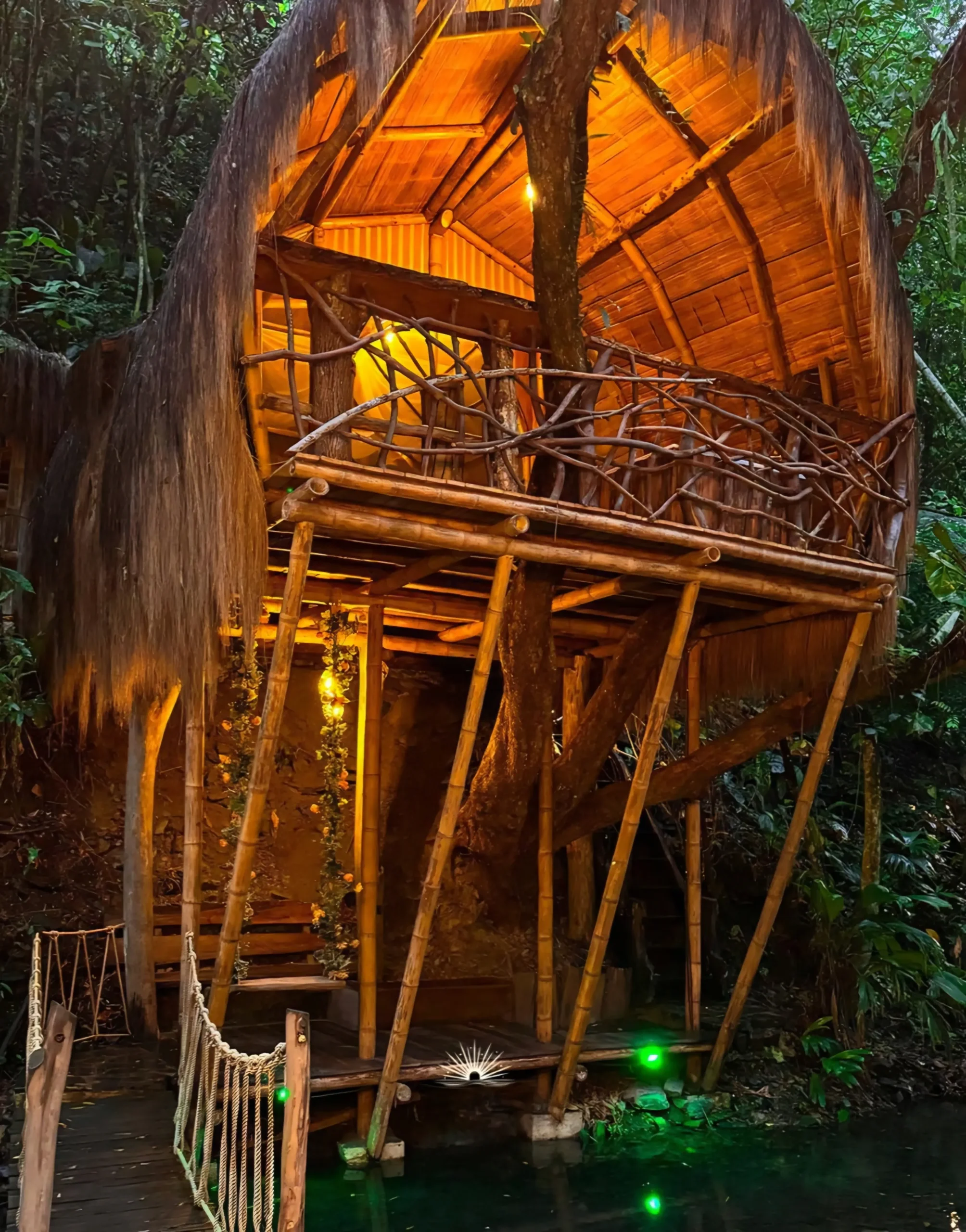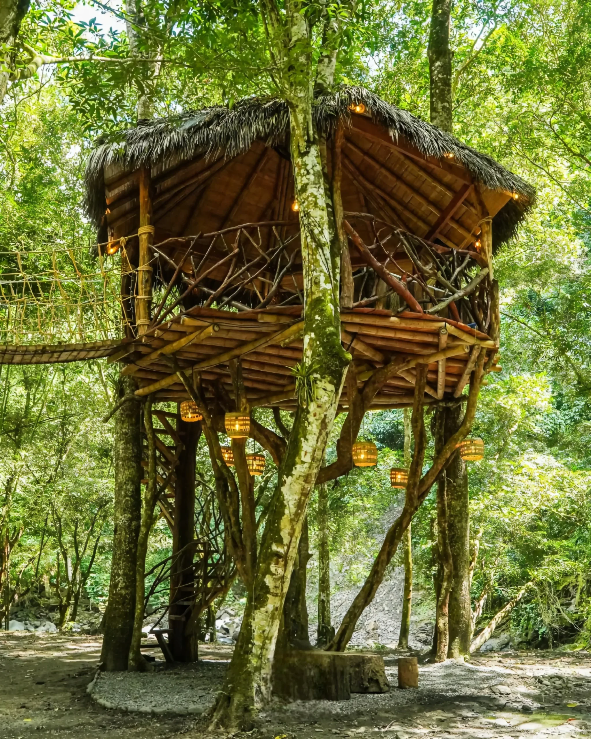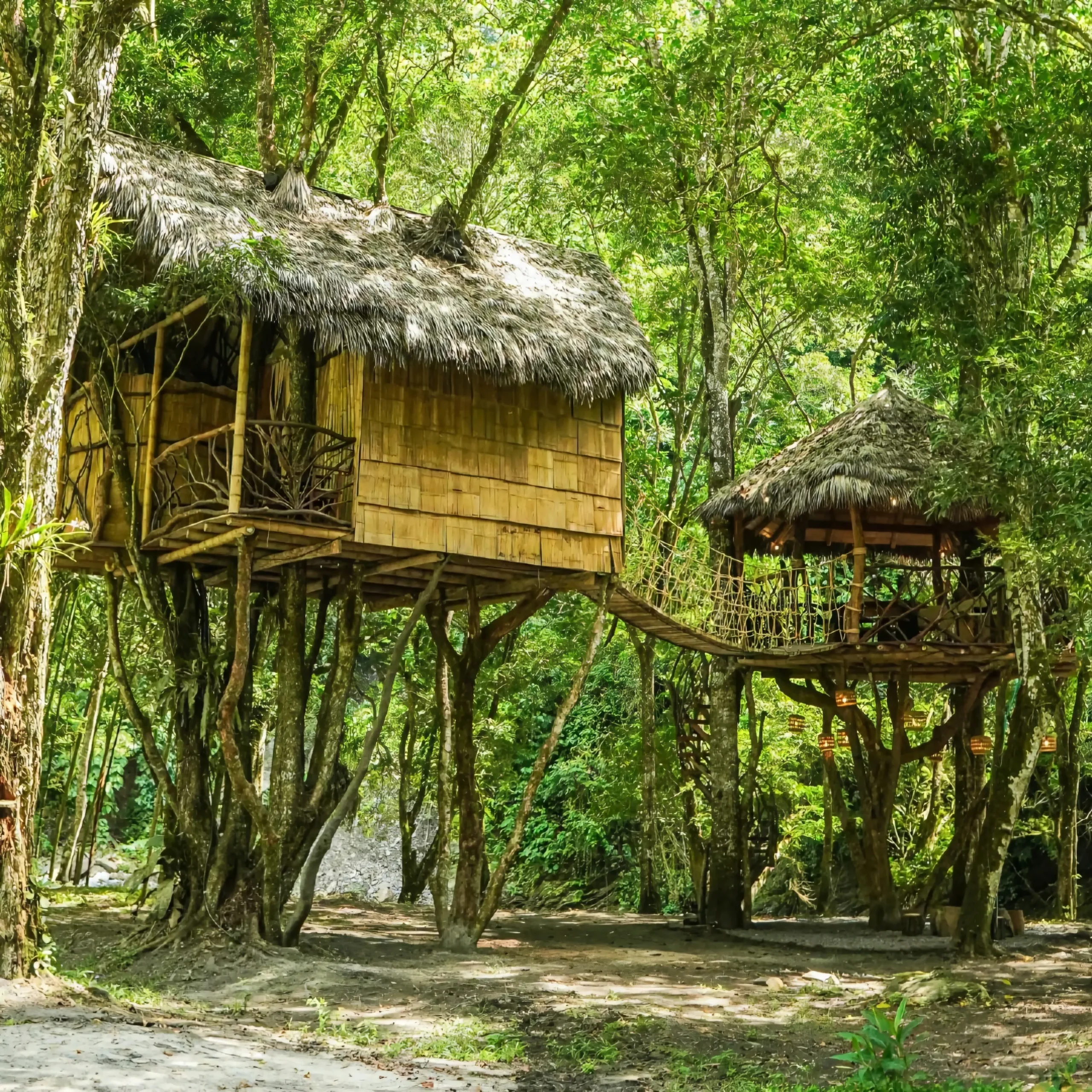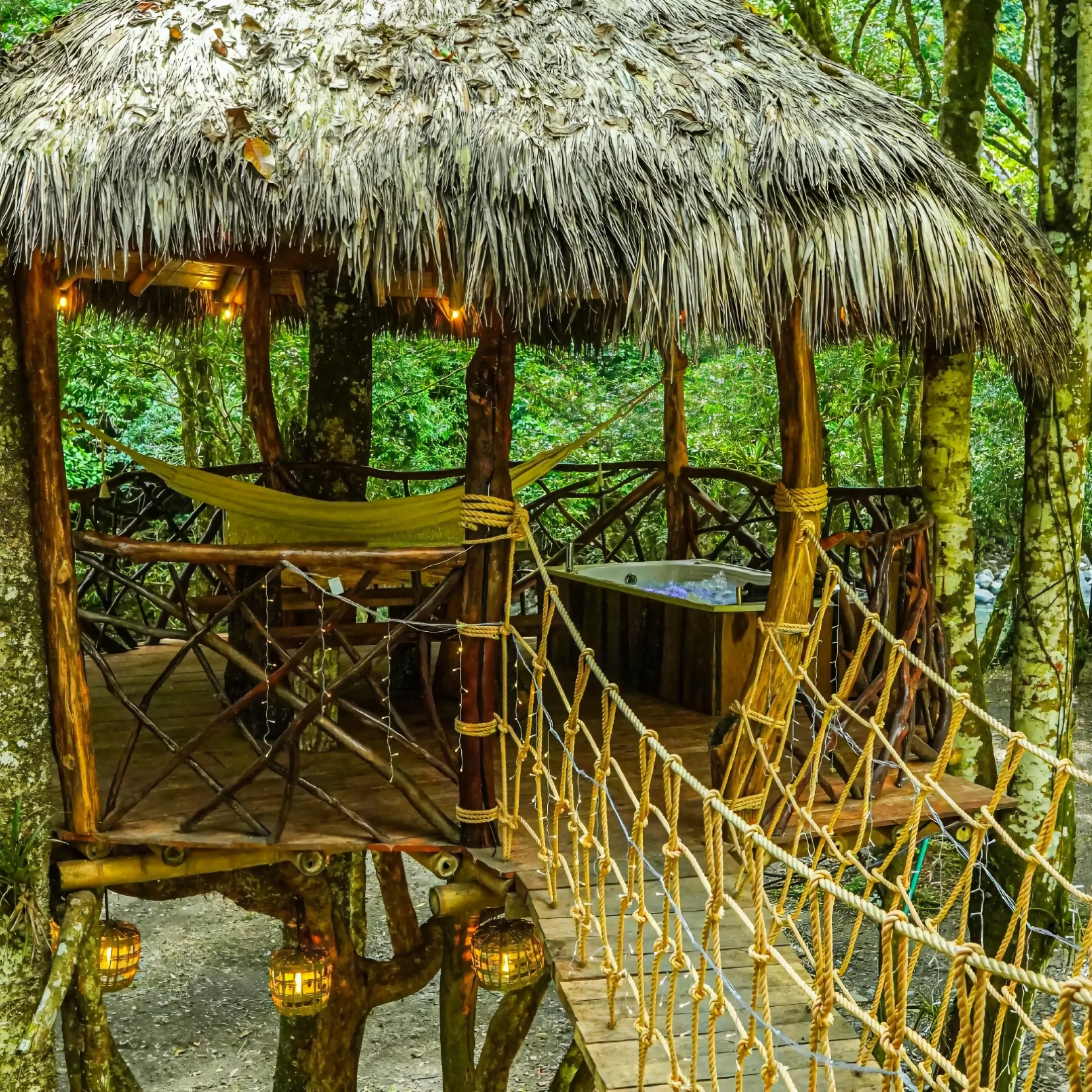 Cabaña privada de dos ambientes, conectados por un puente tibetano, con vista a la piscina y al río.
